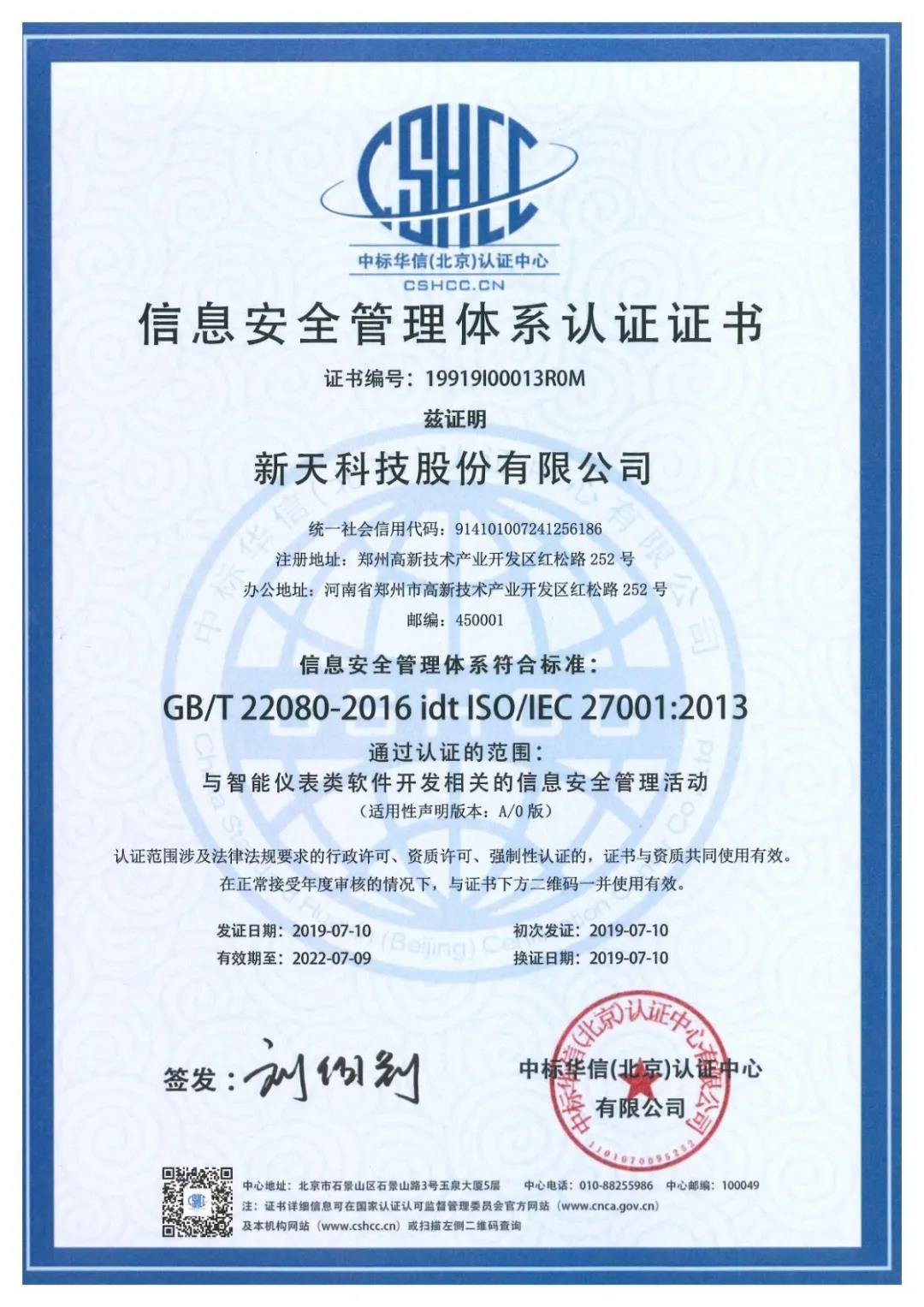 作為國內著名的智能儀表品牌,新天科技不斷加大安全技術防范的投入,確保用戶隱私安全及運營系統穩定。通過聚焦關鍵核心技術,牢牢把握自主創新主動權,吸引培育高端人才團隊,牢筑信息安全屏障。經過多年的實踐和優化,新天科技已建立起一套對標國際的安全管理體系,并在近期通過了ISO27001認證。