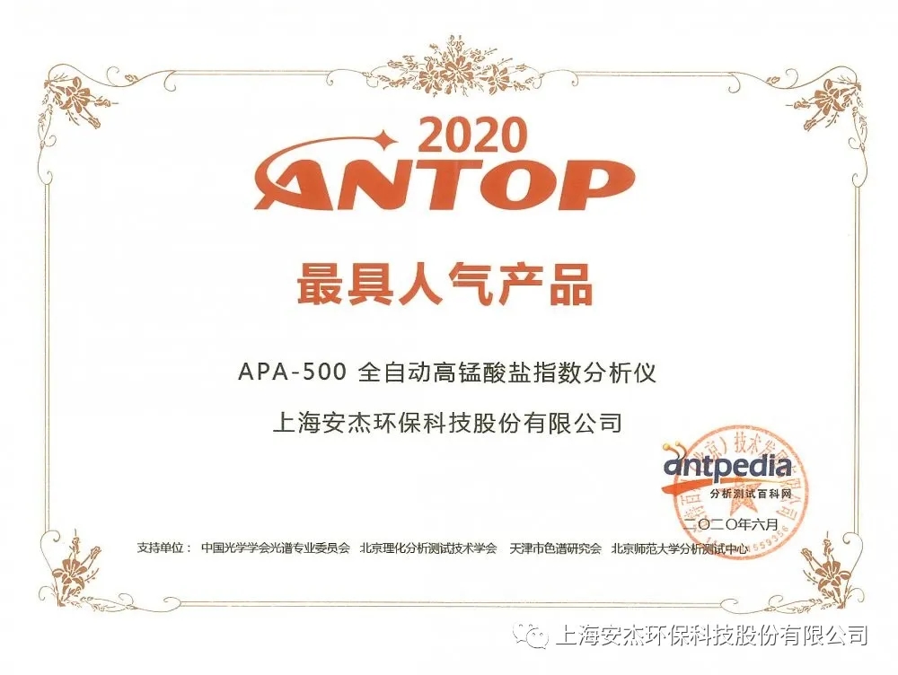 銘記是歷史前行的動力!分析測試百科網特別設立“ANTOP獎”,用以記錄最被行業人士認同、對行業產生卓越貢獻或獨特影響的人/物/事。2020年7月1日,ANTOP2020頒獎盛典于線上隆重舉行。安杰科技APA-500 全自動高錳酸鹽指數分析儀榮獲ANTOP 2020 儀器擬人技術引領者獎、最具人氣產品獎。
