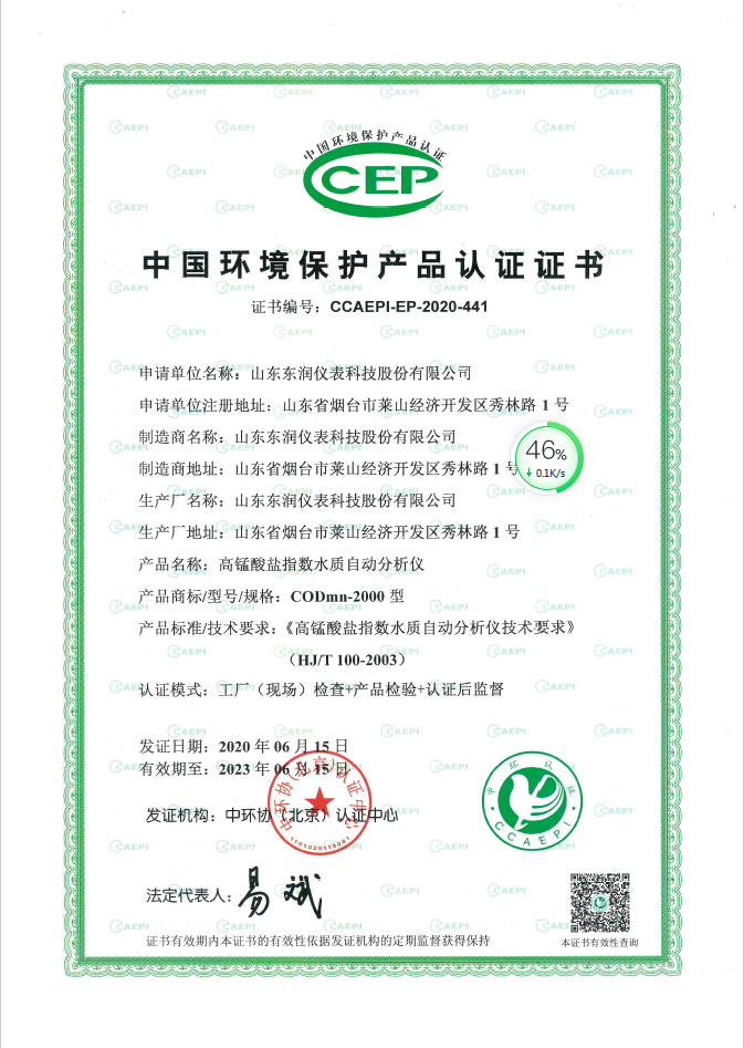 2020年6月20日山東東潤儀表科技股份有限公司通過在北京環(huán)境監(jiān)測總站無故障運行3個月,喜獲CODmn-2000高錳酸鹽指數(shù)水質(zhì)自動分析儀環(huán)保認證證書!