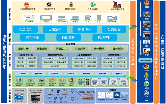 平臺總體框架自下而上分別為基礎設施層、數據資源層、應用支撐層、業務應用層和綜合展現層,以及兩翼的法規與標準規范體系、“三位一體”大網格化監管責任體系、安全與運維保障體系(簡稱“五層三體系”)。
