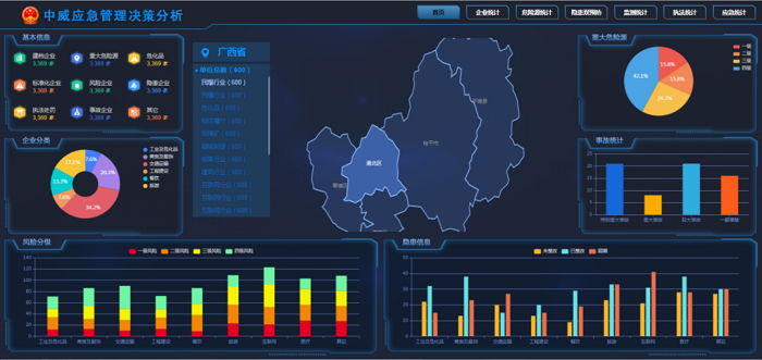 輔助決策子系統:圍繞應急管理工作中不同專題進行綜合分析,不僅能滿足日常監管報表的自動生成功能,同時也體現了如何輔助應急管理工作更加智能化、人性化而進行預判,為應急管理工作掌握重點方向,抓住關鍵問題。主要功能包括綜合分析、企業統計、危險源統計、監測預警統計、執法統計和應急統計。