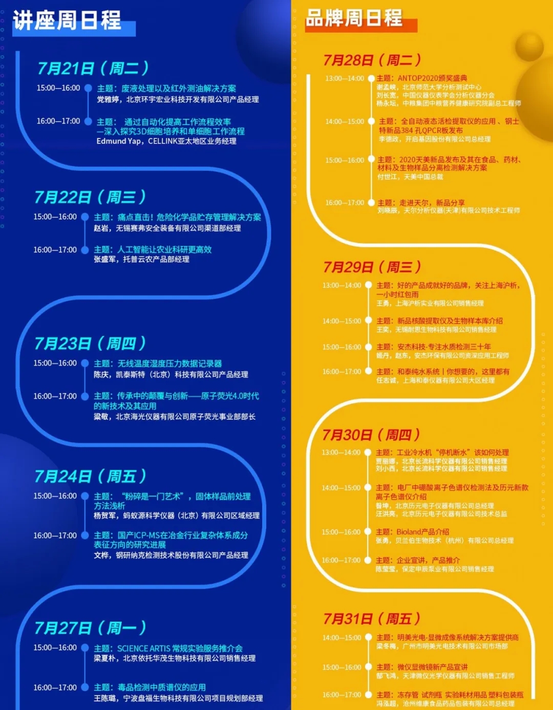 “線上直播”部分,7月21日-31日將有26場次的線上直播,包含了“講座周”、“品牌周”兩大板塊。“講座周”以傳播普及先進技術和經驗為主要內容,“品牌周”以產品推介為主要內容。歡迎科學儀器行業從業者于7月20-31日期間,參觀“CISILE線上展覽”,觀看線上直播。