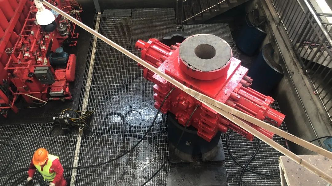 隨后開始剪切試驗,最終在控制油壓24.2MPa的情況下成功剪斷高強度鉆桿;剪切后還按照API標準進行了高低壓水密封試驗,在工作壓力105Mpa下保壓10分鐘,壓力保持穩(wěn)定,說明剪斷鉆桿后,防噴器剪切刀具和密封情況完好;與會領導和專家對神開防噴器剪切測試結果表示非常滿意,至此神開服役了12年的105Mpa防噴器,剪切性能經(jīng)受住了油田“大考”。