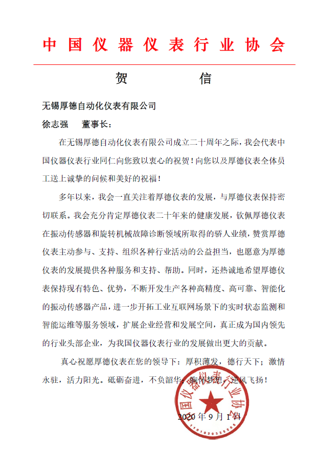 值此無錫厚德自動化儀表有限公司成立二十周年之際,我會向其發(fā)去賀信,代表中國儀器儀表行業(yè)同仁向無錫厚德公司徐志強董事長及厚德儀表全體員工送上誠摯的問候和美好的祝福!