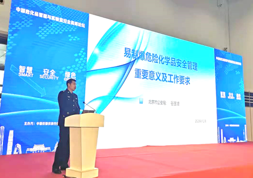 北京市公安局治安管理總隊(duì)危險(xiǎn)物品管理支隊(duì)谷寶峰中隊(duì)長(zhǎng)首先上臺(tái)演講。谷隊(duì)長(zhǎng)以“易致爆危險(xiǎn)化學(xué)品安全管理重要意義及工作要求”為題,通過(guò)引用國(guó)內(nèi)外及其在工作中偵辦的真實(shí)案例生動(dòng)的講述了易致爆危險(xiǎn)化學(xué)品、易制毒危險(xiǎn)化學(xué)品對(duì)人身和社會(huì)帶來(lái)的嚴(yán)重危害,著重介紹了相關(guān)法律法規(guī),闡述了做好危化品管理對(duì)于建設(shè)“平安中國(guó)”的重要意義。