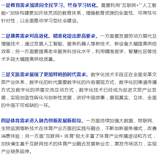 中國特色社會主義進入新時代,我國社會主要矛盾已經轉化為人民日益增長的美好生活需要和不平衡不充分的發展之間的矛盾。新時代對美好生活的需求在教育、醫療健康、養老、托育、家政、文化和旅游、體育等社會服務領域產生了新變化,需要利用新技術以更高效率、更好質量滿足新興需求。新興需求是戰略性新興產業發展的重要拉動力,隨著數字技術的不斷興起,以數字文化、數字教育、數字醫療等為代表的戰略性新興服務業在不斷涌現,它們通過實現創新發展與跨界融合,促進社會服務數字化、網絡化、智能化、多元化、協同化,以更好地滿足美好生活的新需求。