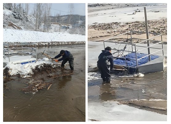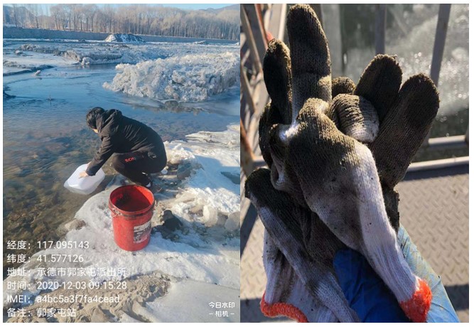 河北省承德市郭家屯、李臺站運維人員黃可新、高凌立對水站進行巡檢時,發現采水口附近堆積了大量樹枝雜物,他們毫不猶豫,穿著水褲下入河水,刨開冰雪清理雜物。雖然腳下的河水冰冷,但是他們的熱情高漲,保證數據“真、準、全”,他們認為一切都是值得的。