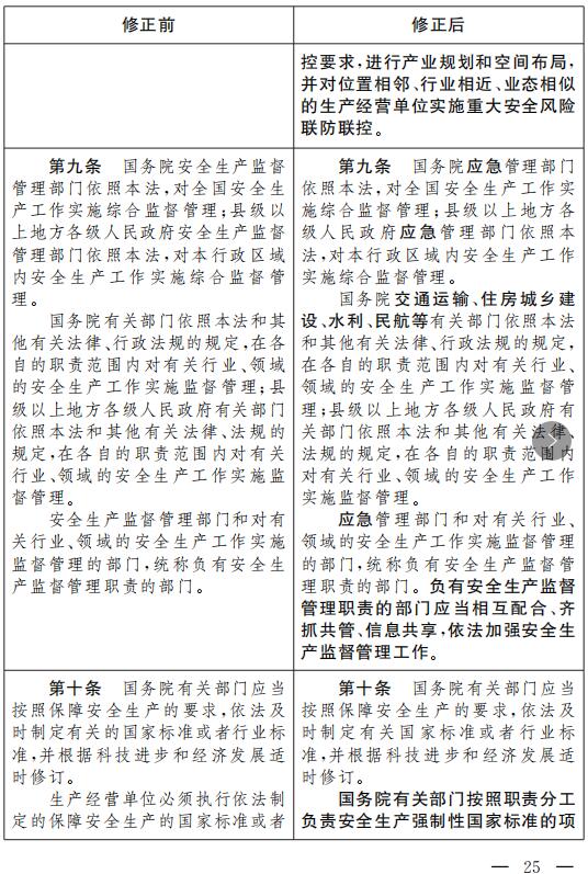(二)將第九條第三款修改為:“應急管理部門和對有關行業、領域的安全生產工作實施監督管理的部門,統稱負有安全生產監督管理職責的部門。負有安全生產監督管理職責的部門應當相互配合、齊抓共管、信息共享,依法加強安全生產監督管理工作。”