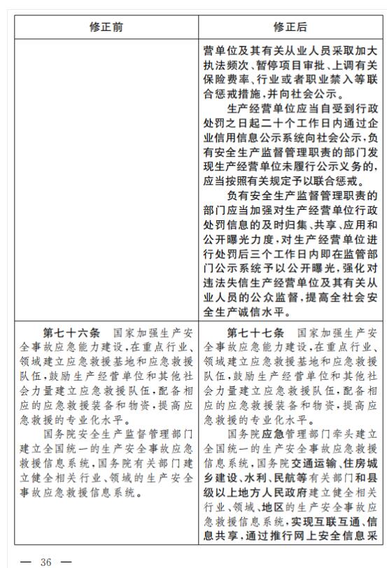 十八、將第七十五條改為第七十六條,修改為:“負有安全生產監督管理職責的部門應當建立安全生產違法行為信息庫,如實記錄生產經營單位及其有關從業人員安全生產違法行為信息;對違法行為情節嚴重的生產經營單位及其有關從業人員,應當及時向社會公告,并通報至行業主管部門、投資主管部門、自然資源主管部門、證券監督管理機構以及有關金融機構。有關部門和機構應當對存在失信行為的生產經營單位及其有關從業人員采取加大執法頻次、暫停項目審批、上調有關保險費率、行業或者職業禁入等聯合懲戒措施,并向社會公示。