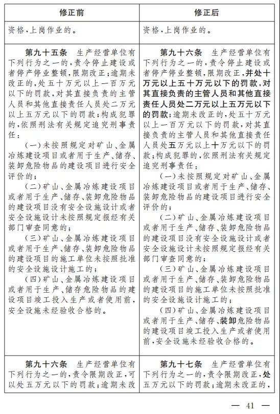二十七、將第九十五條改為第九十六條,修改為:“生產經營單位有下列行為之一的,責令停止建設或者停產停業整頓,限期改正,并處十萬元以上五十萬元以下的罰款,對其直接負責的主管人員和其他直接責任人員處二萬元以上五萬元以下的罰款;逾期未改正的,處五十萬元以上一百萬元以下的罰款,對其直接負責的主管人員和其他直接責任人員處五萬元以上十萬元以下的 罰款;構成犯罪的,依照刑法有關規定追究刑事責任: