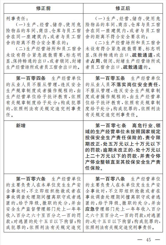 三十一、增加一條,作為第一百零七條:“高危行業、領域的生產經營單位未按照國家規定投保安全生產責任保險的,責令限期改正,處五萬元以上十萬元以下的罰款;逾期未改正的,處十萬元以上二十萬元以下的罰款,并責令停產停業整頓直至其投保安全生產責任保險。”