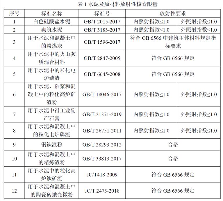 我國從1986年開始,頒布實施了GB 6763 《建筑材料用工業廢渣放射性物質限制標準》等一系列建筑材料放射性物質控制標準。2001年首次頒布了GB6566《建筑材料放射性核素限量》標準,2010年進行第一次修訂,為現行有效版本。GB 6566-2010中規定了建筑主體材料和建筑裝飾裝修材料放射性核素限量值。水泥屬于建筑主體材料,該標準中規定建筑主體材料中天然放射性核素鐳-226、釷-232、鉀-40的放射性比活度應同時滿足內照射指數不大于1.0和外照射指數不大于1.0的要求。對空心率大于25%的建筑主體材料,其天然放射性核素鐳-226、釷-232、鉀-40的放射性比活度應同時滿足內照射指數不大于1.0和外照射指數不大于1.3。我國水泥及原材料產品標準對放射性的要求見下表1。