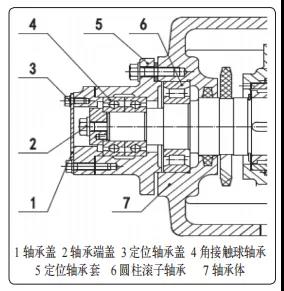 原軸承部件如圖1,圓柱滾子通過軸承體、定位軸承套、軸肩進行定位;角接觸球軸承通過定位軸承套、軸承端蓋、定位軸承蓋以及軸肩進行定位。在此結構中存在軸承的潤滑脂容易堆積,軸的對中不易操作的問題。
