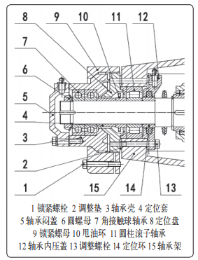 優化后的軸承部件如圖2,圓柱滾子通過定位環、軸承內壓蓋、甩油環以及軸承體進行定位;角接觸球軸承通過定位套、軸承殼、軸承悶蓋以及圓螺母進行定位。特殊之處是增加了幾個零部件,使的軸承潤滑效果更好、更易實現軸的對中、以及在不拆泵的情況下雙向調節葉輪與吸排氣圓盤的間隙,分別作如下解釋說明: