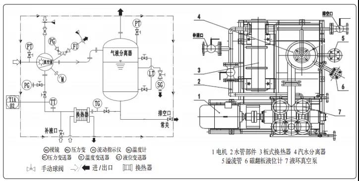 機組模塊是指液環真空泵機組系統,其中包括液環真空泵、汽水分離器、電機、換熱器、壓 力儀表、溫度儀表、液位計以及閥門等儀器。真空泵用來抽吸并壓縮氣體,以便在密閉容器中形成真空;汽水分離器顧名思義就是將氣體中的混合液體分離出來,得到含水分較少的氣體;電機是整個機組機械能的動力源;換熱器用于降低工作液的溫度;壓力儀表、溫度儀表、液位計用于監測壓力,溫度,液位的變化,以保證壓力,溫度,液位在合理的位置;閥門用于控制工作液和氣體通斷。機組模塊的圖樣通常也包含兩部分,PID圖和模塊圖。PID圖相當于機組工作原理圖,用于說明機組的組成部分,工作流程;模塊圖主要用于生產加工較為直觀。