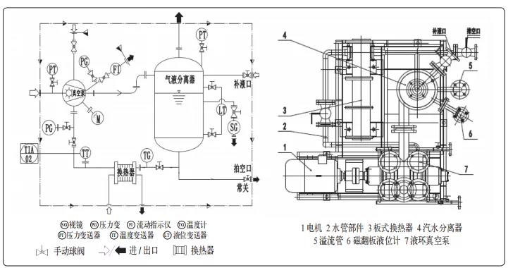 優化改進的機組模塊如圖4:工作液的補充是從汽水分離器罐的某一合理位置(工作液液面以 上)加入,加入的工作液與汽水分離器罐里原有的工作液混合,混合后的工作液進入板式換熱器進行冷卻隨后進入液環真空泵,參與其工作。這樣的改動解決了以下問題: