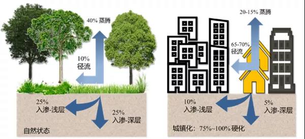城市是人口高度聚集、社會經(jīng)濟也高度發(fā)達的地區(qū),是資源環(huán)境承載力矛盾最為突出的地方。改革開放以來,我國進入了城鎮(zhèn)化快速發(fā)展階段,城鎮(zhèn)化率從1979年的不到20%,發(fā)展到當今的60%左右,年均增幅接近1%。在傳統(tǒng)城市建設理念的影響下,城市開發(fā)建設帶來的城市下墊面過度硬化,城市的“地穿甲”割裂了山水林田湖草的生態(tài)系統(tǒng),改變了原有的自然生態(tài)本底和水文特征,切斷了水的自然循環(huán)過程,破壞了城市水文徑流特征的原真性(見圖1);同時,城市建設高強度開發(fā)、填湖(塘)造地、伐林減綠,忽略或任意調(diào)整豎向關系等粗放做法,在加快降水產(chǎn)匯流的同時,也加大了降雨徑流量和匯流峰值。