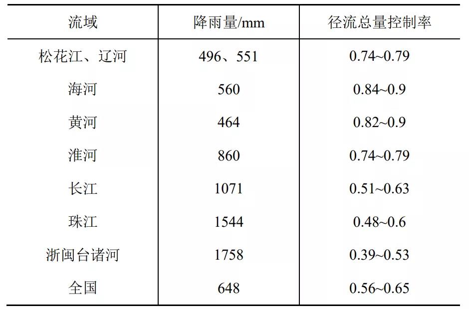 海綿城市建設是基于對自然本底的保護與修復,因此確定徑流總量控制率時必須要掌握城市所在地的降雨自然徑流規(guī)律與特點,依此來確定。當?shù)氐淖匀粡搅饕?guī)律和特點與降雨量、下墊面狀況、土壤滲透性以及地下水位等因素有關,可通過多年降雨形成產(chǎn)匯流的水文統(tǒng)計數(shù)據(jù)推導得出。在海綿城市建設初期推廣時,住建部印發(fā)的《海綿城市建設技術指南》中給出了北京建筑大學研究團隊收集國內(nèi)200多個城市降雨資料統(tǒng)計計算繪制的參考圖,供當時試點城市和各地在確定徑流總量控制率時參考。筆者根據(jù)水利部水文局1986年《中國水資源評價》統(tǒng)計數(shù)據(jù)計算的徑流總量控制率見表2,地處流域中上游的城市可取上限值、下游城市可取下限值。