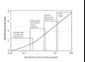 年徑流總量控制率主要是針對中小降雨事件,可依據(jù)多年降雨資料導出降雨徑流總量控制率與降雨量的對應關系,其統(tǒng)計計算方法可參考《海綿城市建設技術指南》或《海綿城市建設評價標準》(GB/T51345-2018)。依徑流總量控制率確定的設計降雨水深與徑流控制設施的服務范圍設計降雨徑流控制設施的規(guī)模。年徑流總量控制率指標應該通過城市規(guī)劃分解到各個排水分區(qū)或開發(fā)建設的地塊上,再依據(jù)建設性詳規(guī)具體落實到實施項目上。