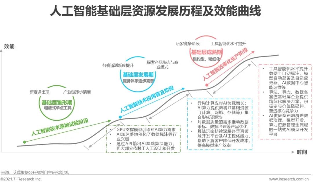 智能化轉型趨勢下,企業部署AI項目的需求正經歷著變化,對數據質量、模型生產周期、模型自學習水平、模型可解釋性、云邊端多樣部署方式、人力成本及資金投入、投資回報率等的要求都逐步走高。在上述需求特點及自動機器學習、AI芯片硬件架構等技術發展的共同推動下,AI基礎層資源的整體效能水平也在不斷進化,以有效降低需求企業的AI開發成本。大致涵蓋相互交融的三個階段:雛形期,算法/算力/數據各模塊多為粗放式的單點工具,新興產品及賽道逐步出現;快速發展期,各賽道活躍度顯著提升,參與者積極探索產品形態與商業模式,基礎層服務體系逐步完善、資源價值凸顯;最后則向成熟階段過渡,各賽道內企業競爭加劇,逐步跑出頭部企業。同時各賽道間企業生態合作增多,一站式工具平臺出現。