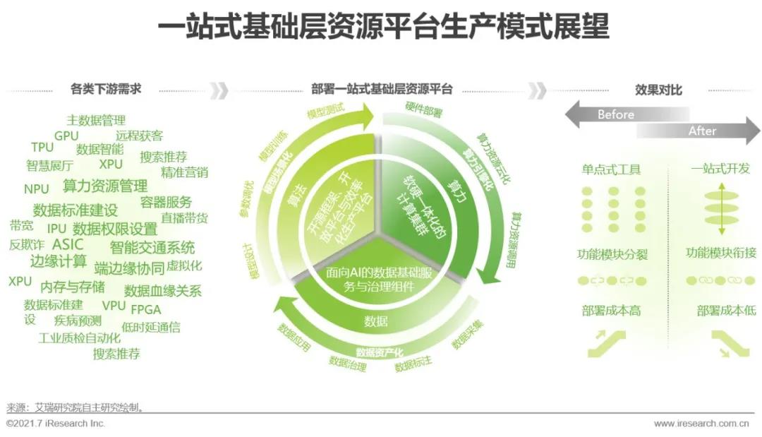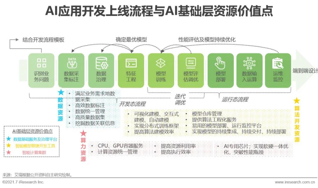 在人工智能由技術落地應用階段向效率化生產階段轉變的背景下,艾瑞認為人工智能基礎層的各模塊工具有望走向集約型的生產模式。該模式主要能賦予開發企業以下價值:1)開發方式改進:從客戶需求分析到解決方案部署形成獨立的閉環,構建端到端的工作流。在強大算力的支持下,完成數據采集、數據標注、數據治理、數據應用、模型設計、參數調優、模型訓練、模型測試、模型推理的全棧式流水線生產。2)管理效率提升:將數據、算法與算力委托給專業的服務商,實現一站式托管,打通三者之間的銜接壁壘,提高交互友好性,讓開發者專注于業務。3)部署成本降低:集成數據、算法、算力的各個軟件與硬件,企業可在一個平臺內按需選擇自己所缺失的模塊組件并自由搭配,有效避免因采購不同供應商的產品或服務而帶來的隱性成本損失與顯性成本損失。