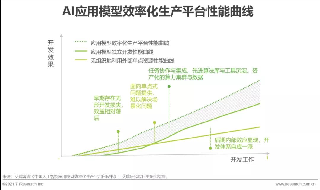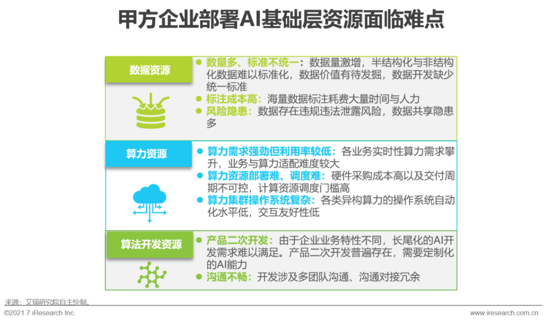 根據艾瑞2020年執行的CTO調研,2019年超過51%的樣本企業AI相關研發費用占總研發費用比重在10%以上,202065.9%的企業AI研發占比達到10%以上。一方面是甲方企業不斷增長的對智能化轉型的強勁需求,一方面則是在AI應用開發與部署過程中企業普遍面臨的數據質量(49%)、技術人才(51%)等基礎資源配置難點。且目前只有少數企業可以完成AI項目實施前設定的全部投資回報率(ROI)標準,因此甲方企業在投資AI項目時相對審慎。AI基礎層資源則可有效緩解甲方利用AI技術重塑自身業務時的投資矛盾,提升模型生產效率,降低部署成本:數據資源集群具備數據采標與數據治理能力,且一站式的數據平臺可對實時數據進行統一管理,提高數據利用率;高效的AI算力集群與調度系統可滿足模型訓練與推理需求,降低總擁有成本(TCOTotalCost of Ownership);基于算法開發平臺演化出的語音識別、計算機視覺、機器學習等專業的AI模型生產平臺,可提供高效、一站式的AI模型生產服務。