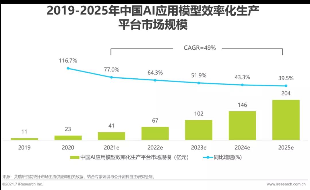 AI應用模型效率化生產平臺是全棧式的、可實現流水線開發的AI應用模型生產工具。假若每次開發模型都需要算法工程師單獨完成從生產到上線的全流程搭建,就會導致很多時間的耗損與AI模型開發成本的浪費。集成了數據、算法與算力的相應開發工具的模型開發工具包——AI應用模型效率化生產平臺應運而生。據艾瑞統計與預測,2020年我國AI應用模型效率化生產平臺市場規模為23億元;到2025年,相應規模可達到204億元,2021-2025年的相關CAGR=49%2020年,AI應用模型效率化生產平臺相關業務拓展相對較快、產品恰逢創收伊始階段,故同比增速增幅較快。與此同時,因參與技術門檻偏高,具備能力的廠商較少,市場尚未形成穩定狀態,市場集中度偏高。