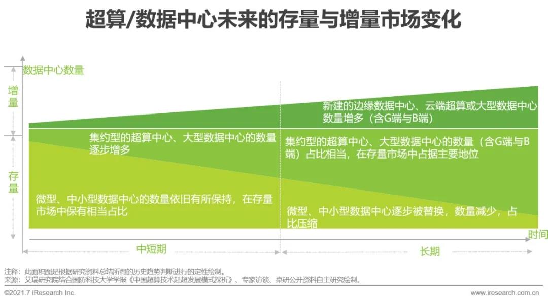 從市場變化趨勢來看:1)存量市場:日漸增加的AI計算負載需要處理力更強、能耗承受度更大的數據中心,同時,一系列有關控制數據中心PUE值的節能審查規定相繼出臺,一味盲目擴建、新建數據中心已難合時宜,促進老舊數據中心綠色化改造的減量替代方案因此誕生。微型、中小型數據中心會逐漸被改造為集約型的大型數據中心,符合節能減排相關標準、機柜數量與異構組合增多的集約型超算/數據中心將在存量市場中占據主流。2)增量市場:考慮到邊緣計算可分擔AI計算任務、兼具低延時優勢,管理邊緣計算中心則需要布局相應的大型云端數據中心,故增量市場會被異構的邊緣計算數據中心與云端超算或大型數據中心擴充。
