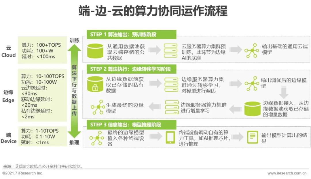 在人工智能與5G等技術的沖擊下,設備端產生大量實時數據,若直接上傳到云端處理,會對云端的帶寬、算力、存儲空間等造成巨大壓力,同時也存在延時長、數據傳輸安全性等問題。因此,為緩解云端的工作負載,云計算在云與端之間新增了若干個邊緣計算節點,從而衍生出端--云的資源、數據與算力協同。在算力協同的業務模式下,靠近云端的云計算中心承擔更多的模型訓練任務,貼近端側的各設備主要進行模型推理,而二者之間的邊緣側則負責通用模型的轉移學習,幫助云端分散通用模型訓練任務、處理實時計算的同時,也解決了終端算力不足、計算功耗大的難題。未來,邊緣計算的發展會催生出更適宜邊緣計算場景的算力集群異構設計,其異構化程度將會高于傳統的數據中心,異構設計的突破將會進一步提高端--云的整體計算效能,進而加速AI模型的訓練與推理。