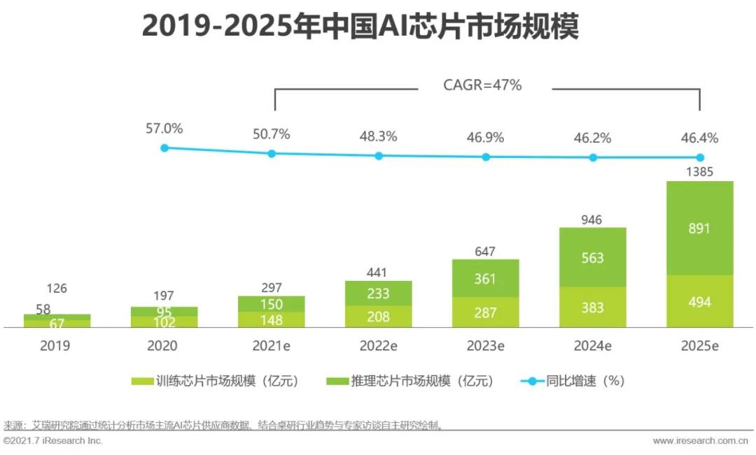 AI芯片是人工智能產業的關鍵硬件,也是AI加速服務器中用于AI訓練與推理的核心計算硬件,被廣泛應用于人工智能、云計算、數據中心、邊緣計算、移動終端等領域。當前,我國的AI芯片行業仍處于起步期,市場空間有待探索與開拓。據艾瑞統計與預測,2020年我國AI芯片市場規模為197億元,到2025年,我國AI芯片市場規模將達到1385億元,2021-2025年的相關CAGR=47%,市場整體增速較快。從AI芯片的計算功能來看,一開始,因AI應用模型首先要在云端經過訓練、調優與測試,計算的數據量與執行的任務量數以萬計,故云端訓練需求是AI芯片市場的主流需求。而在后期,訓練好的AI應用模型轉移到端側,結合實時數據進行推理運算、釋放AI功能,推理需求逐漸取代訓練需求,帶動推理芯片市場崛起。2025年,云端推理與端側推理成為市場規模增長的主要拉動力,提升了逐漸下滑的AI芯片市場規模同比增速。