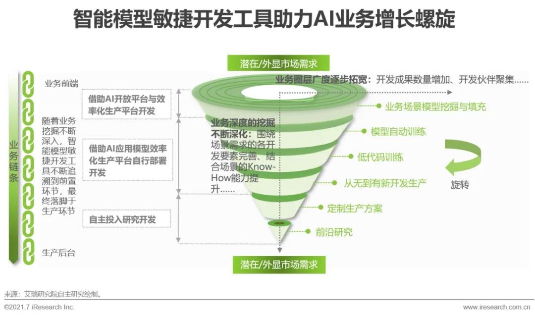 在人工智能產業發展的過程中,智能模型敏捷開發工具可持續拓寬與深挖AI業務的廣度和深度。從廣度講,AI開放平臺形成平臺效應,調用平臺API的開發者聚集創新,針對不同業務場景的開發成果數量逐漸增多,提高了技術產品的利用率,打造出輕量化的輸出模式、降低單位開發成本,并且構建出動態更新的服務池;與此同時,一站式AI應用模型效率化生產平臺逐步填充因場景多元化而衍生出的長尾業務模型,豐富模型供應市場的種類與數量。從深度講,二者均從業務前端發掘潛在或外顯的市場需求,針對剛需應用與高價值環節延伸出多條增量建設與運行需求業務線,瞄準市場風口的同時,敏捷、經濟地消化個性化或碎片化需求,根據需求柔性匹配生產。