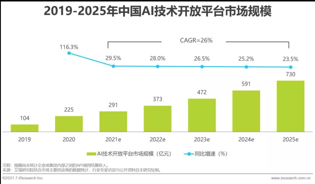 隨著數據量與AI算力的提升,可落地的場景與算法的交互變得愈加頻繁,二者結合開發出的AI應用模型就需要更大量地通過API調用AI技術開放平臺的AI技術能力。據艾瑞統計與預測,2020年我國AI技術開放平臺市場規模為225億元,到2025年,相應規模可達到730億元,2021-2025年的相關CAGR=26%。受API經濟興起的影響,2020年市場規模同比增速走高較快,2021年下滑后恢復平穩態勢。按AI技術能力劃分,計算機視覺類與語音技術類收入占比達72.2%,是收入的主要貢獻來源。人臉識別、人體識別、OCR文字識別、圖像識別等構成了計算機視覺類業務的主要技術能力,且計算機視覺類的技術價格相較于其他技術而言更高,應用領域也更為廣泛。現階段的市場集中度相對分散,未來,能持續投入成本、研發出強勁算法的廠商有望占領更多的市場份額,市場集中度亦會因此提升。