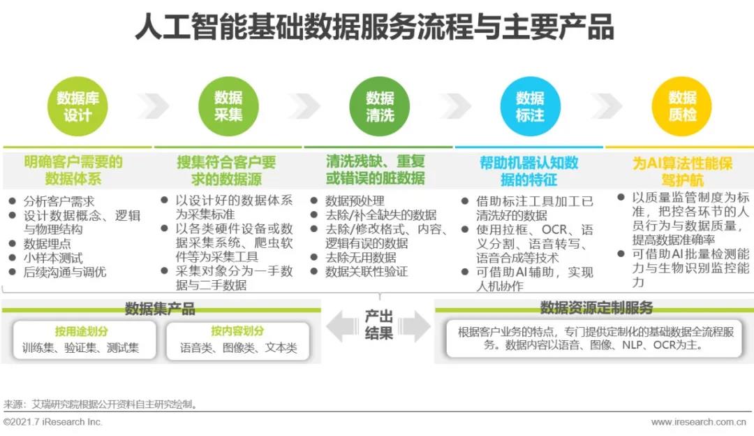人工智能基礎數據服務是指為各業務場景中的AI算法訓練與調優而提供的數據庫設計、數據采集、數據清洗、數據標注與數據質檢服務。整個基礎數據服務流程圍繞著客戶需求而展開,最終產出產品以數據集與數據資源定制服務為主,為AI模型訓練提供可靠、可用的數據。數據采集、數據標注與數據質檢是較為重要的三個環節。數據采集是數據挖掘的基礎,提供多源的一手數據和二手數據;數據標注對數據進行歸類與標記,為待標注數據增加標簽,生產滿足機器學習訓練要求的機器可讀數據編碼。數據質檢為數據的客觀性和準確性設置檢驗標準,從而為AI算法的性能提供保障。AI基礎數據服務商可著重在以上三個環節建立壁壘,以鞏固行業地位。
