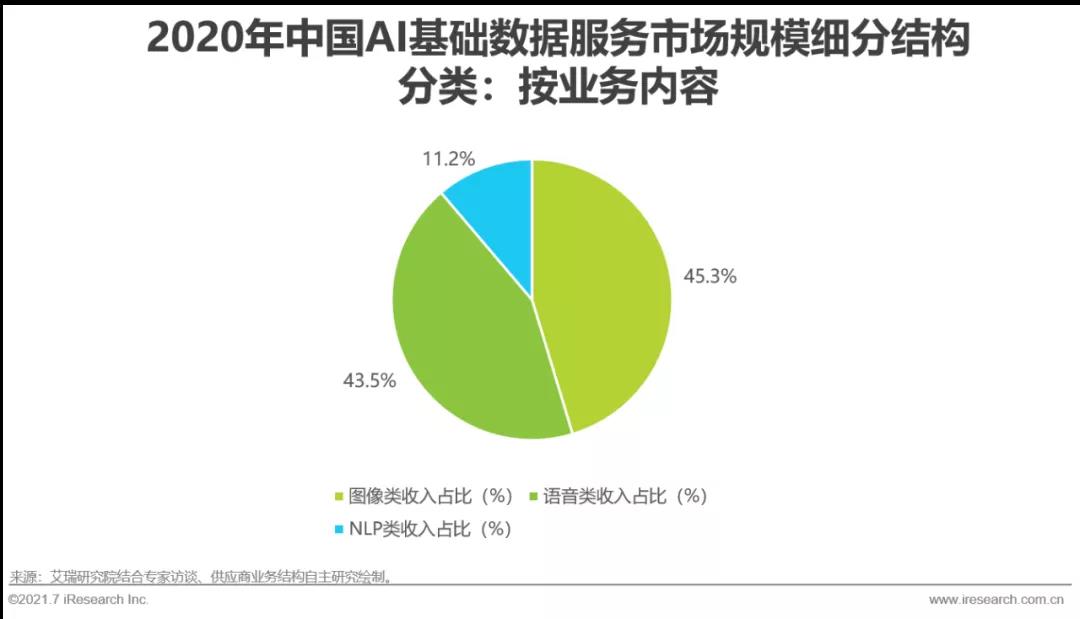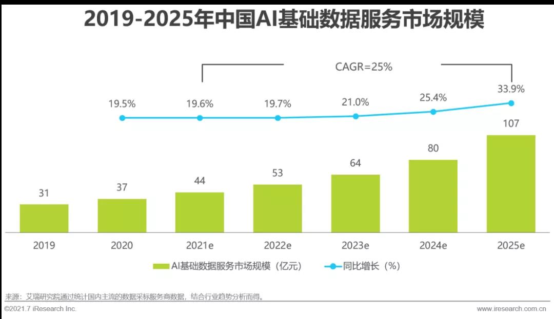 高質量的數據是提高AI應用模型訓練速度與精度的必要準備之一,而行之有效的AI基礎數據服務又為提高數據質量奠定了堅實的基礎。因而,提供通用化、精細化、場景化的AI基礎數據服務才能滿足日漸增長的AI應用模型訓練需求。據艾瑞統計與預測,2020年我國AI基礎數據服務市場規模(含數據采集與標注)為37億元,到2025年,相應規模可達到107億元,2021-2025年的相關CAGR=25%,整體增速呈現穩步提升的趨勢。從市場細分收入結構來看,圖像類與語音類收入占總收入規模的88.8%,是業務的主要構成部分;圖像類與語音類收入基本持平,圖像類業務以智能駕駛與安防為主,而語音類業務以中英大語種、中國本土方言以及外國小語種為主。目前,行業中也相應地分成了以圖像類或語音類為主的供應商陣營,各類供應商將會繼續立足于主營業務,深挖現有應用場景的業務細分需求,從而帶動未來收入的增長。