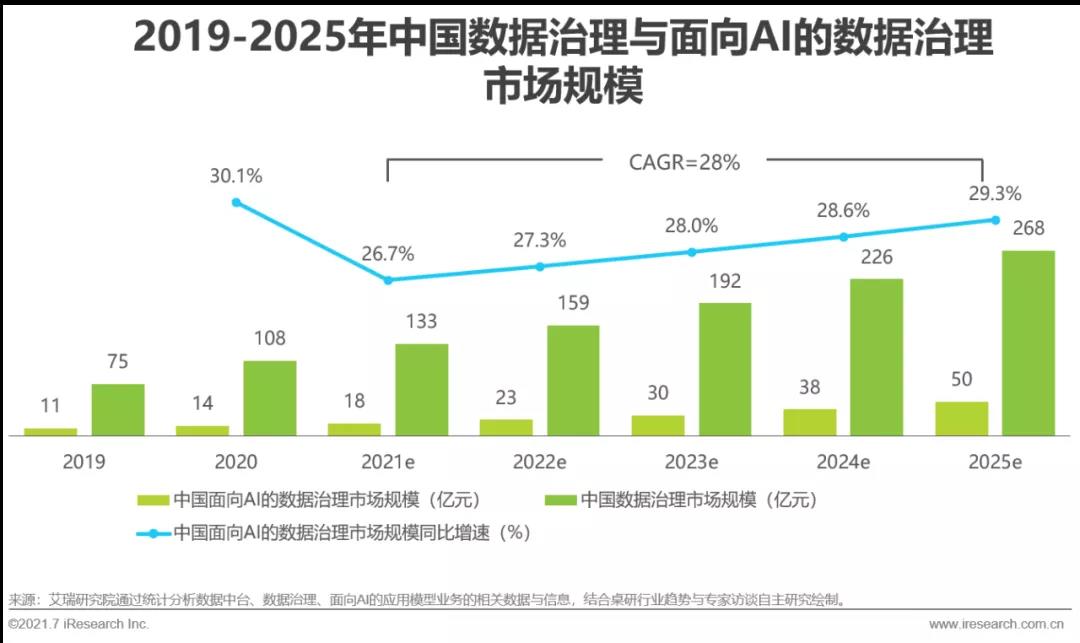 在數字化轉型與智能化轉型的大趨勢下,數據治理工作一般伴隨著數據中臺的搭建以及AI應用模型的開發而展開。數據治理屬于數據中臺的構成組件,數據治理的工作與服務則屬于數據中臺建設、運營與維護中不可缺少的環節。與此同時,以AI應用模型所需的數據標準去治理數據,結合AI技術提升數據的可用度與模型的訓練效率,才能夠更好更快地為人工智能業務前端服務,改善供應商的業務流程與消費者的消費體驗。據艾瑞統計與預測,2020年我國面向AI的數據治理市場規模為14億元,到2025年,相應規模可達到50億元,2021-2025年的相關CAGR=28%2018年,數據中臺概念興起,其規模在2020年處于爆發點,而數據治理作為數據中臺的組件,也于同期迎來增長爆發點,從而帶動面向AI的數據治理。2020年后,數據中臺市場規模增速開始降溫,數據治理也隨之回落,面向AI的應用模型開發業務在該過程中的帶動作用有限,故2021年的業務同比增速出現拐點。后期,面向AI的應用模型開發業務的帶動效應逐步凸顯,規模增速呈現穩步爬坡態勢。