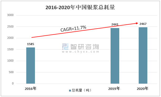 由于光伏裝機需求的快速增長,中國光伏銀漿需求整體呈現平穩上升態勢。中國光伏銀漿總耗量由2016年的1585噸增加至20202467噸,年復合增長率為11.7%