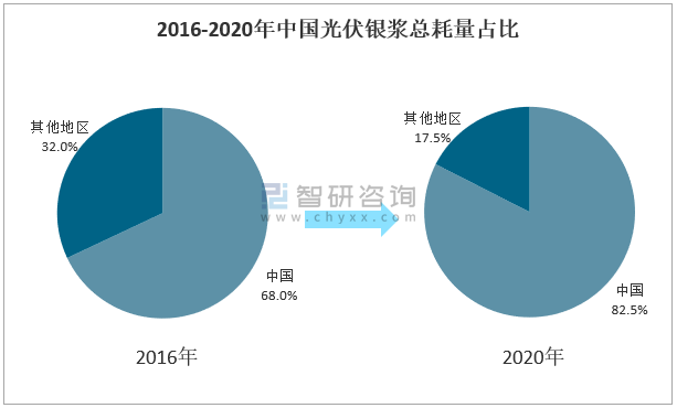 數據顯示:中國光伏銀漿總耗量占全球比重不斷提升,2016年占比為68.0%,2020年占比達到82.5%,提升了14.5個百分點。