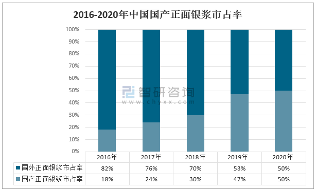 我國光伏銀漿產業起步較晚,2011年之前技術一直未有突破,因此早期主要以進口為主。受益于國家光伏產業政策扶持,國內光伏產業迅速崛起,光伏產能逐步釋放疊加產業鏈逐步完善,打破了國內光伏漿料長期依賴國外巨頭的市場格局。國產正面銀漿市占率從2016年的18%上升至2020年的50%