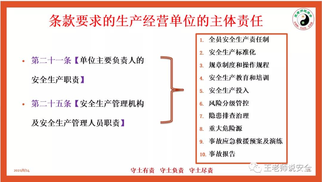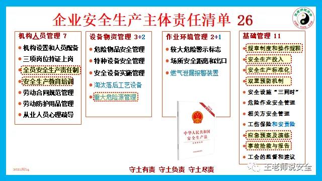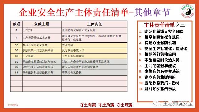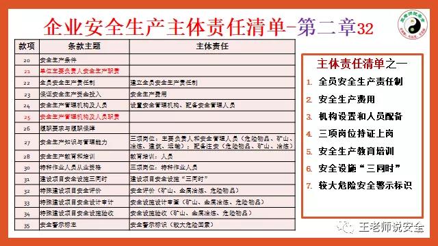 3、在以上清單中,用淺黃色圈出來的9條主體責(zé)任,是企業(yè)的主要負(fù)責(zé)人和安全生產(chǎn)管理人員的相關(guān)職責(zé);鑒于其要求本身和盡職履責(zé)的重要性,特別做了提示。