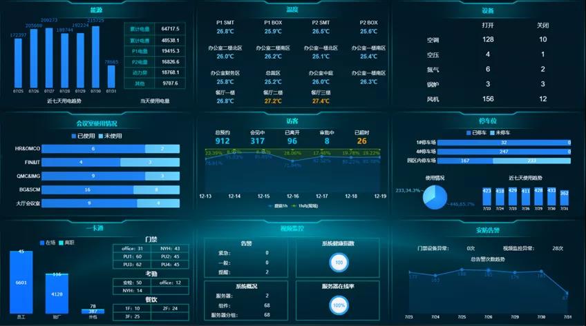 智慧工廠要求對園區(qū)的視頻監(jiān)控、安防報警、人員巡查、門禁考勤、訪客管理、一卡通管理、停車位、會議室、信息發(fā)布、能源使用情況、環(huán)境變化、設(shè)備參數(shù)等工作進行實時在線的統(tǒng)一管理,企業(yè)可利用傳感器技術(shù)實現(xiàn)動態(tài)捕捉、熱成像報警、人臉識別、溫濕度感應(yīng)等,再利用OA或報表系統(tǒng)實現(xiàn)在線巡檢、信息發(fā)布、會議室線上預(yù)約、訪客線上登記等,將系統(tǒng)數(shù)據(jù)和傳感器數(shù)據(jù)利用微服務(wù)接口的方式進行調(diào)用,形成園區(qū)全貌管理指標,最后利用3D建模技術(shù)開發(fā)智慧園區(qū)全局管理模型或利用數(shù)據(jù)分析工具制作園區(qū)綜合管理駕駛艙,實現(xiàn)對園區(qū)資源的統(tǒng)一高效管理,打造綠色、高效、安全的智慧園區(qū)。