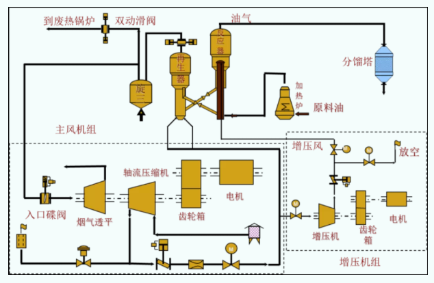 催化裂化是最復雜的煉油工藝過程之一。催化裂化裝置的構成一般包括:反應-再生器部分、主風機部分、分餾部分、氣壓機部分、吸收穩定部分、余熱鍋爐部分和低溫熱利用部分。有的裝置還包括汽油脫硫醇等產品精制部分。