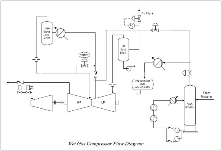 由分餾塔頂油氣分離器來的富氣,經富氣壓縮機(“氣壓機”習慣叫法)入口前的文丘利管及入口閘閥進入氣壓機的第一段壓縮,壓縮后的氣體進入中間氣體冷卻器,富氣經冷卻器冷至40度后,進入氣壓機的氣液分離器進行氣液分離。分液后的氣體進入氣壓機二段壓縮,然后出口進入吸收穩定部分。氣壓機中間分液罐分離出的凝縮液則由凝縮液泵送入吸收穩定部分,小型裝置可返回分餾部分。有的裝置在壓縮機入口設有氣液分離罐,并配有相應的凝液排出系統。考慮到緊急狀態,設有富氣放火炬系統,由放火炬線上風動蝶閥或風動閘閥控制。為在機組事故緊急停機時能及時將入口卸壓,在停機信號發出時,入口放火炬閥連鎖自動打開。為了防止機組喘振,采用二段防喘振回路控制,來控制防喘振調節閥開度,以保證操作點不進入喘振區,保持壓縮機運行的穩定。