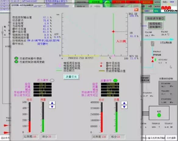 通過主風機組出口壓力及出口流量自動控制靜葉及防喘振閥的控制方案,實現兩個控制回路之間的解耦。在此項目之前國內沒有項目成功投用主風量與壓力全自動控制軸流式主風機組靜葉和防喘閥。可以選擇流量優先或壓力優先兩種自動控制模式,實現了主風機的最佳工作工況和穩定運行。