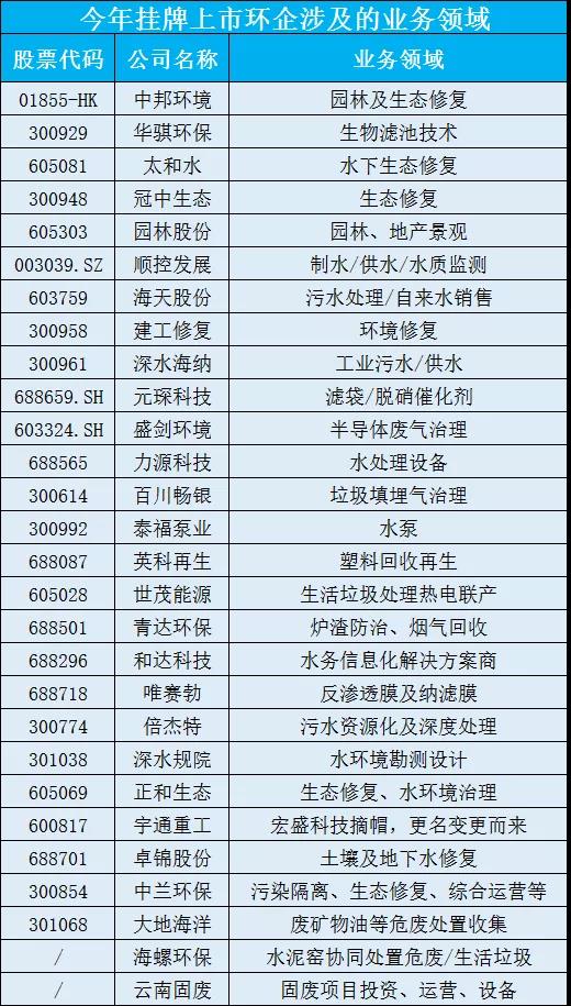 而如今上市的環(huán)保企業(yè),無論是主板,還是創(chuàng)業(yè)板、科創(chuàng)板,都有一個共性,就是大都是給早期工程項目做配套、做服務(wù)、做運營的企業(yè),這些企業(yè)伴隨著“前輩們”成長,他們自身也在壯大。所以我們看到近兩年上市的企業(yè),既是環(huán)保行業(yè)非常細分的子領(lǐng)域,也是產(chǎn)業(yè)下游設(shè)備技術(shù)廠商,做膜、水泵、生物濾池、勘測設(shè)計、水質(zhì)監(jiān)測、垃圾滲濾液、填埋氣治理的都紛紛登錄資本市場(如下圖)。
