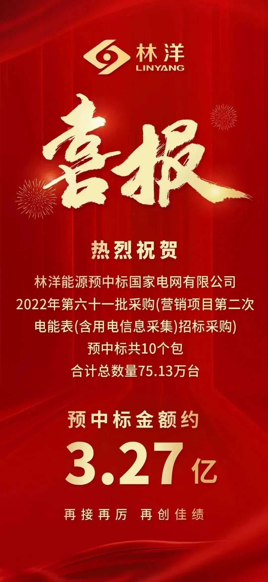 林洋能源預中標國家電網有限公司2022年第六十一批采購(營銷項目第二次電能表(含用電信息采集)招標采購),合計中標金額約3.27億元。
