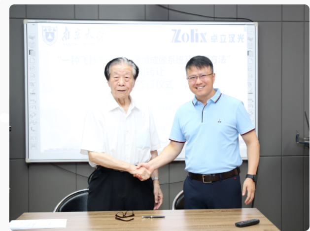 2023年6月15日,卓立漢光集團董磊副總經理帶領研發團隊拜訪南京大學陳洪淵院士團隊,在南京大學仙林校區化學樓隆重舉行了“一種飛秒干涉散射顯微成像系統及測量方法”專利轉讓的簽約儀式。