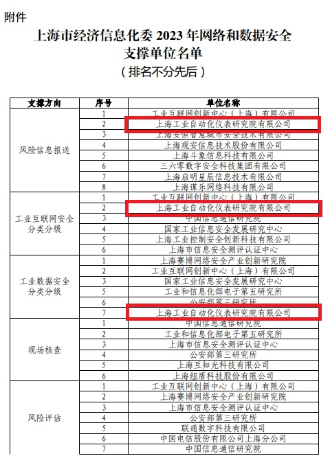 6月21日,上海市經(jīng)濟和信息化委員會(以下簡稱“經(jīng)信委”)發(fā)布2023年網(wǎng)絡和數(shù)據(jù)安全支撐單位名單(滬經(jīng)信軟[2023]513號),上海工業(yè)自動化儀表研究院有限公司(以下簡稱“自儀院”)在風險信息報送、工業(yè)互聯(lián)網(wǎng)安全分類分級、工業(yè)數(shù)據(jù)安全分類分級、風險評估、應急保障領域成功入選。