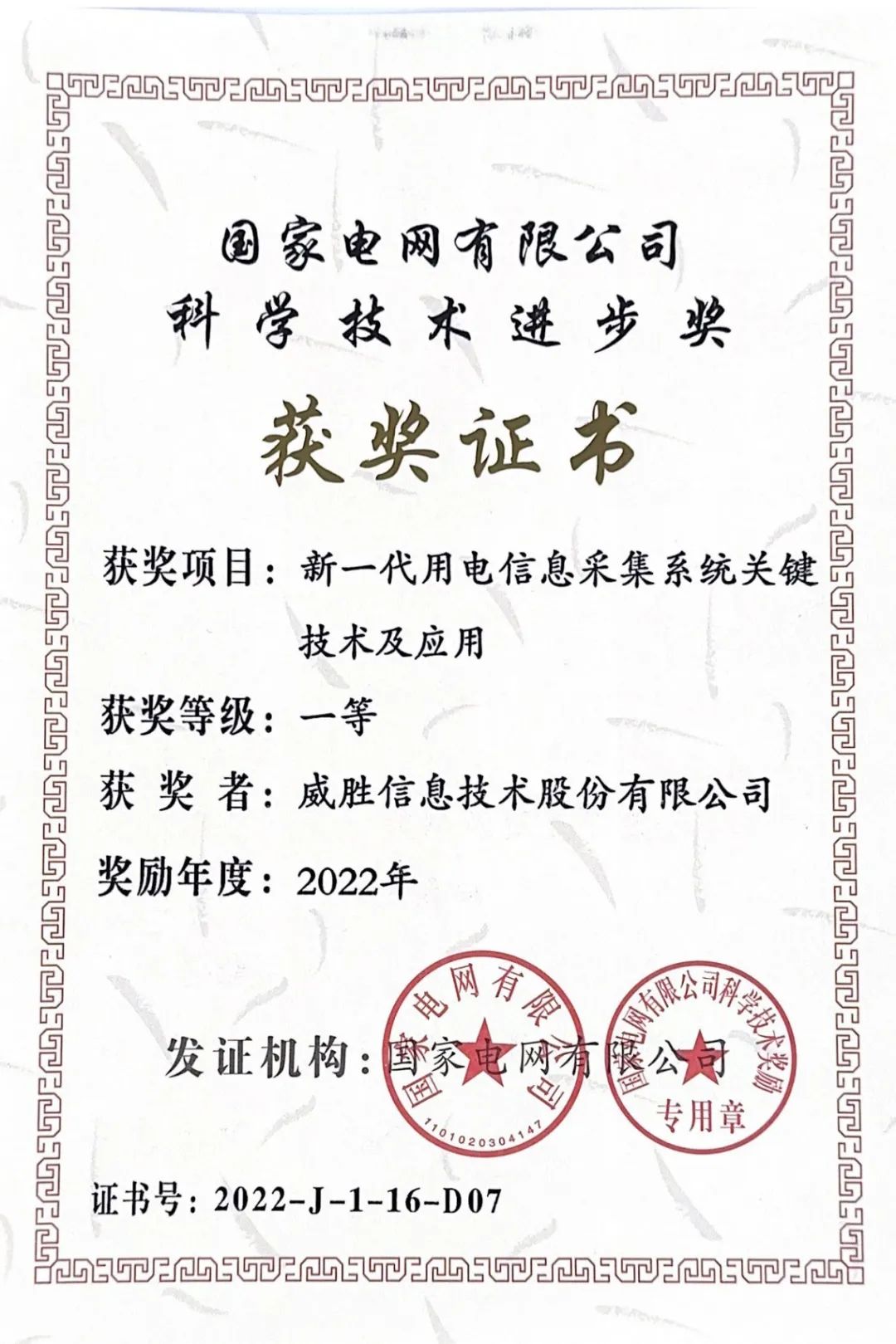 近日,威勝信息參與的“新一代用電信息采集系統(tǒng)關(guān)鍵技術(shù)及應(yīng)用”項目獲得國家電網(wǎng)有限公司2022年度科學技術(shù)進步一等獎。