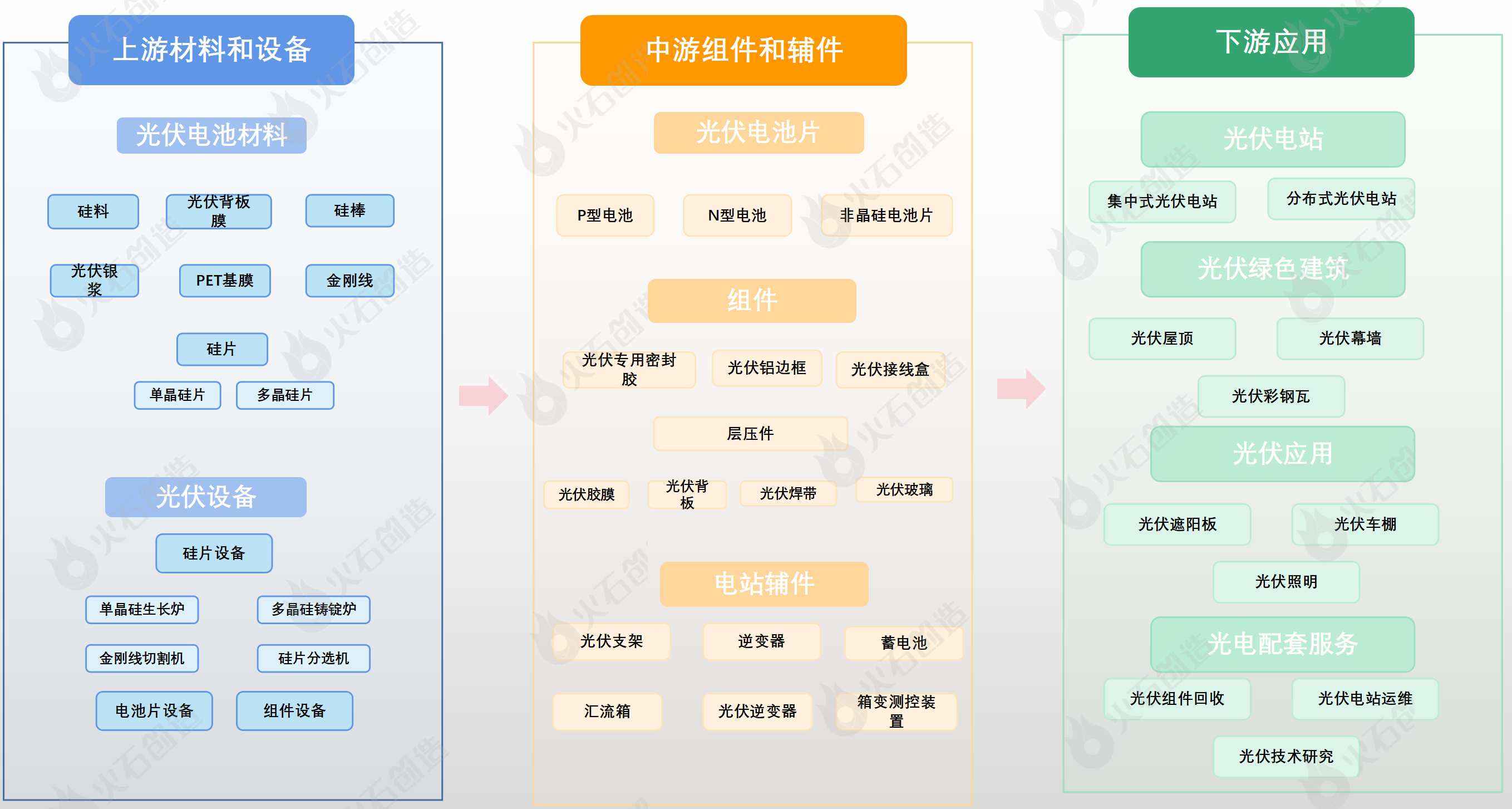 從光伏產業(yè)鏈看,上游包括硅料、硅片、PET基膜等光伏電池材料,以及硅片設備、電池片設備、組件設備等;中游包括光伏電池片、光伏組件、電站輔件等;下游包括光伏電站建設運營、光伏綠色建筑、光伏應用、光電配套服務等。