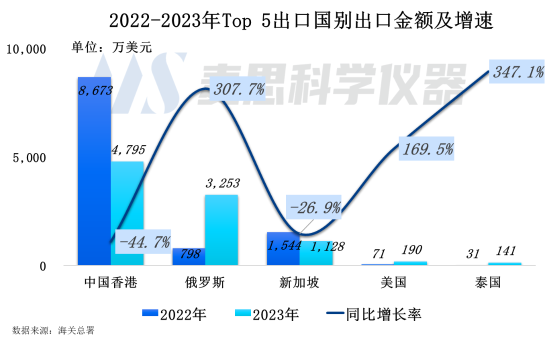 2023年出口到香港以及新加坡的質譜儀器下滑明顯。出口到中國香港的質譜儀器金額為4795萬美元,同比大幅下降44.7%,幾近腰斬。出口至新加坡的質譜儀器金額為1128萬美元,同比下降26.9%。
